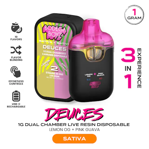 Experience the ultimate in vaping innovation with Deuces, our dynamic dual-chamber tank filled with Live Resin Sativa goodness. On one side, savor the invigorating citrus explosion of Lemon OG, while on the other, indulge in the mysterious blend of exotic flavors in Pink Guava Runtz. Operate Deuces effortlessly with three lights - Red, Blue, and Red/Blue - signifying each flavor. Tap once to switch between flavors, or double-tap to enjoy a fusion of both. Perfect for those seeking uplifting sativa vibes, Deuces lets you customize your journey and double down on flavor and fun. Why settle for two flavors when you can have three?