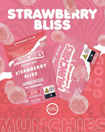Step into the radiant sweetness of Strawberry Bliss by MUNCHIES, where the bright, juicy flavor of freshly picked strawberries unfolds in a wave of smooth, uplifting delight. Infused with premium cannabis, each gummy delivers 10mg THC paired with 5mg CBG, creating a vibrant experience crafted to elevate mood and bring a sense of feel-good balance. CBG helps encourage a bright, blissful state often linked to elevated mood, calm mental clarity, and a gentle sense of overall well-being. The result is a smooth, flavorful experience that feels light, positive, and effortlessly enjoyable. Sweet, uplifting, and perfectly balanced, Strawberry Bliss delivers a vibrant burst of strawberry flavor in a moment of pure MUNCHIES feel-good indulgence.
