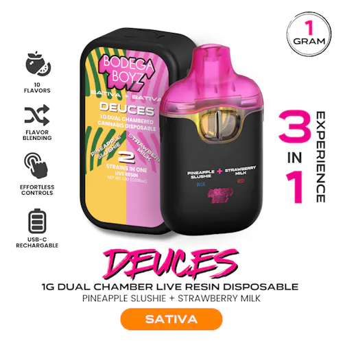 Quench your thirst for adventure with our Pineapple Slushie and Strawberry Milk duo, designed to keep you energized and inspired in our innovative Deuces dual-chamber tank. On one side, Pineapple Slushie delivers a tropical explosion of flavor, refreshing your palate with the tangy sweetness of ripe pineapple and a hint of icy coolness. Meanwhile, Strawberry Milk on the other side offers a creamy indulgence, blending luscious strawberries with velvety milk for a smooth and satisfying experience. Both strains boast the invigorating effects of sativa varieties, perfect for igniting your creativity and keeping you focused throughout the day. Whether you're embarking on a new project or seeking inspiration for your next big idea, our Pineapple Slushie and Strawberry Milk combo has you covered. Tap once to switch seamlessly between flavors, or double-tap for a unique fusion that dances on your palate. Experience the flexibility to enjoy each flavor individually or mix them for an unparalleled taste adventure. Elevate your vaping journey with this dynamic trio - because why settle for two flavors when you can savor three?