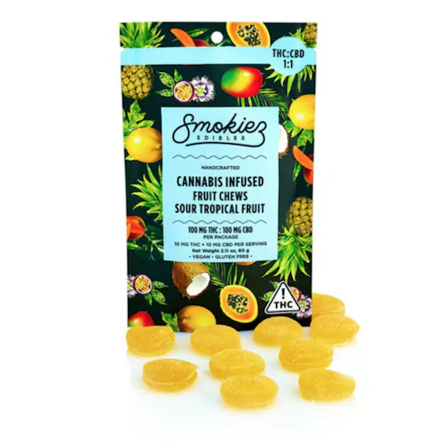A harmonic blend of CBD and THC, Smokiez Sour Tropical Fruit CBD:THC 1:1 Fruit Chews are NOT YOUR AVERAGE FRUIT CHEWS™ ;)