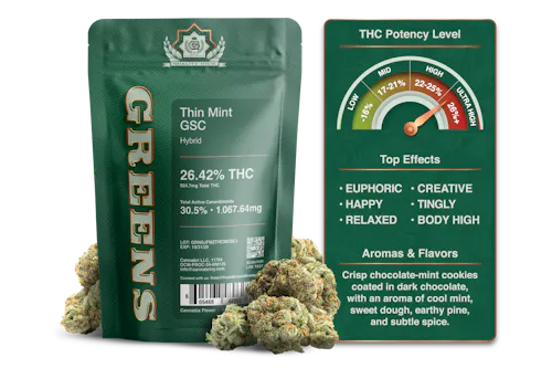 Thin Mint GSC is the smooth operator of the GREENS collection. This high-THC flower blends sweet, minty, and earthy tones to create a flavor that is rich, creamy, and unforgettable. Each inhale delivers balance and focus, while every exhale leaves a refreshing finish that lingers.